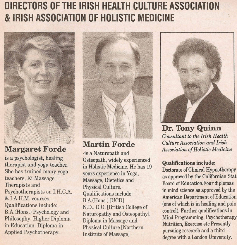 The Irish Health Culture Association was operated by EDUCO Cult leader “Dr” Tony Quinn, Martin Forde and his ex-wife Margaret Forde (both who have been members since the 1970’s communes).
