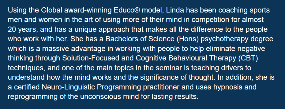 Using the Global award-winning Educo® model, Linda has been coaching sports men and women in the art of using more of their mind in competition for almost 20 years, and has a unique approach that makes all the difference to the people who work with her. She has a Bachelors of Science (Hons) psychotherapy degree which is a massive advantage in working with people to help eliminate negative thinking through Solution-Focused and Cognitive Behavioural Therapy (CBT) techniques, and one of the main topics in the seminar is teaching drivers to understand how the mind works and the significance of thought. In addition, she is a certified Neuro-Linguistic Programming practitioner and uses hypnosis and reprogramming of the unconscious mind for lasting results.