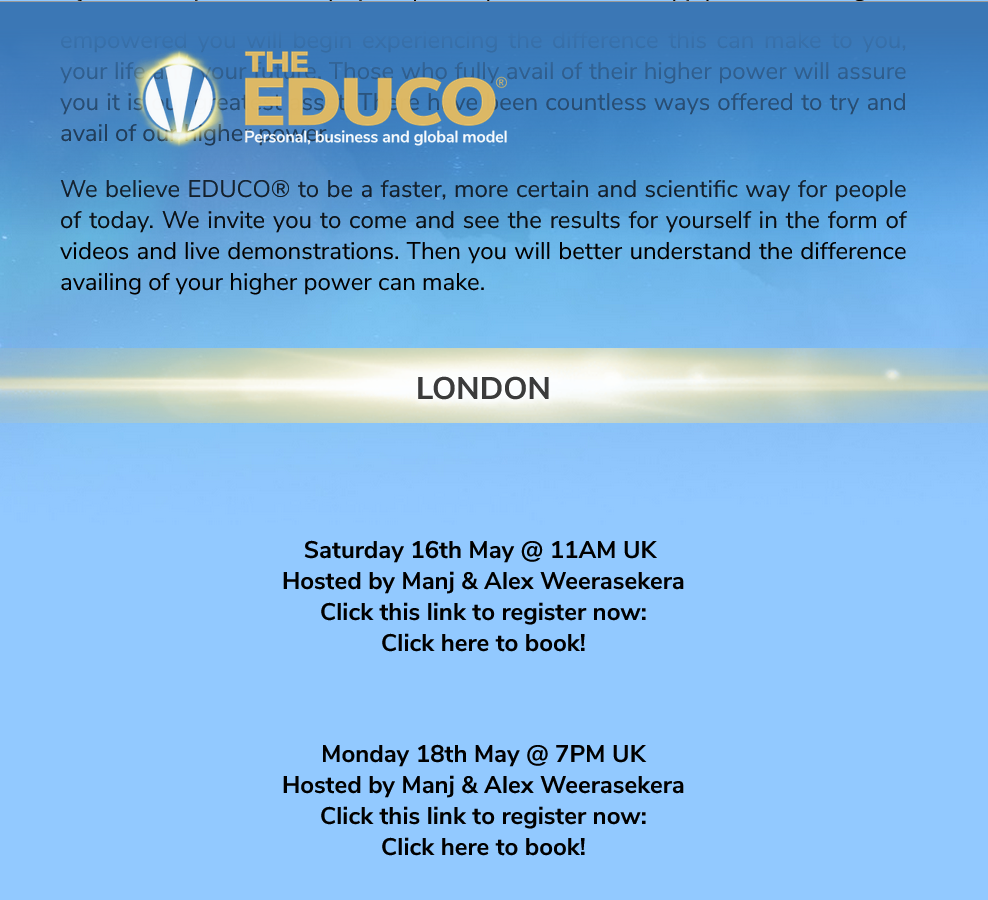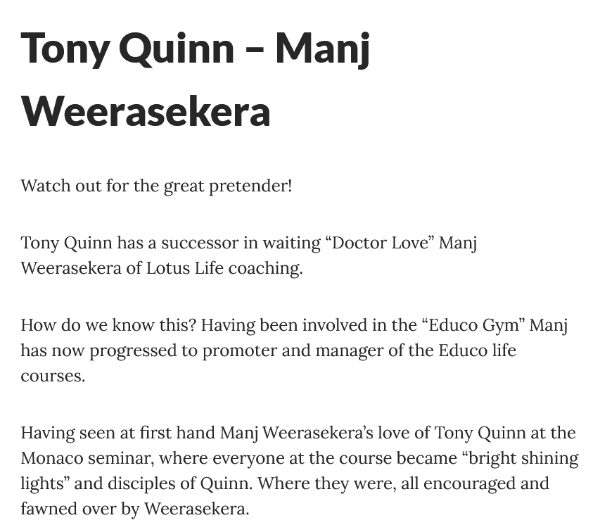 In May 2020 the EDUCO Cult’s official website Educoworld stated Weerasekera and Alex Weerasekera (Alexandra Jones) were holding introductory recruitment events in London to lure victims to the remote EDUCO seminar hosted by Cult leader “Dr” Tony Quinn.