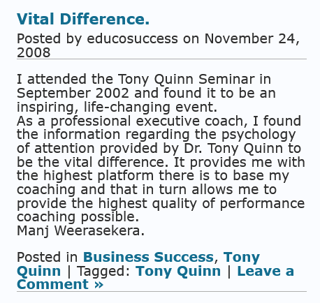 As a professional executive coach, I have found the information regarding the psychology of attention provided by Dr Tony Quinn to be the vital difference that makes the difference. It provides me with the highest platform there is to base my coaching and that in turn allows me to provide the highest quality of performance coaching possible.