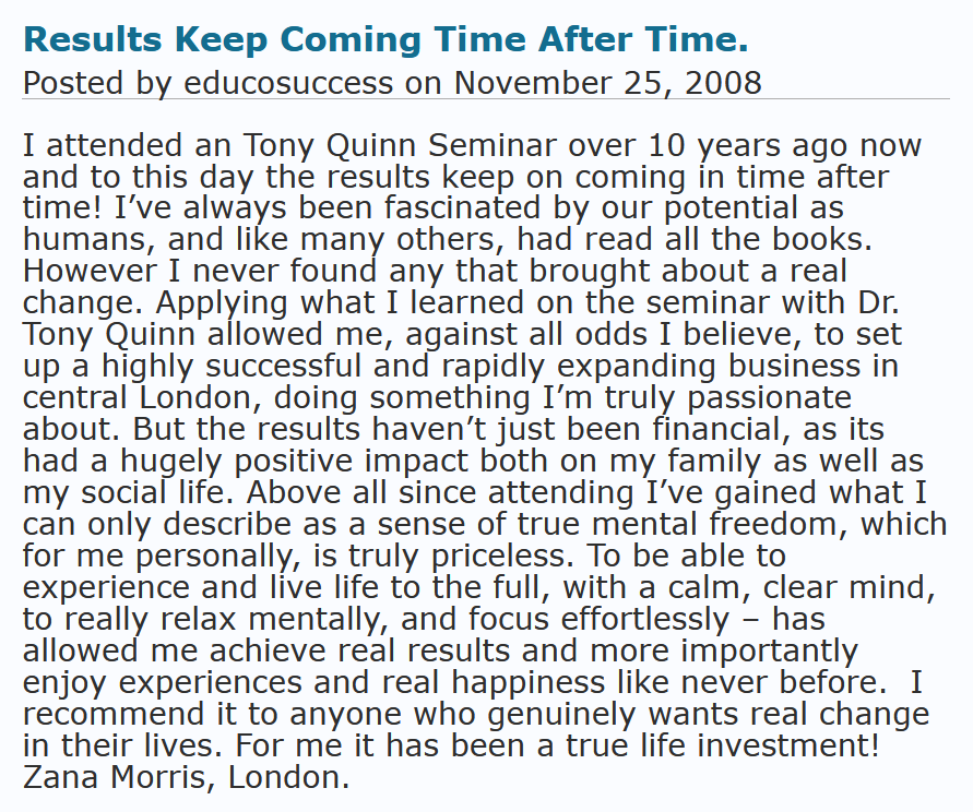 In 2008 Morris left this testimony on the “Tony Quinn Educo Seminars Home of the Invincible Vision!” website, alongside other members Manj Weerasekera, Babu Shah, Ranjeev Singh Sidhu, Alexandra Weerasekera, Mary Ann Malone, Jagir Singh/Shah, Cherrelle Woodstock, Thurston Pym, Jamie Myerscough, Josh Stewart, Lyndon Morris, Neera Menon, Mary Monks, Maggie Lawrie, Karen Kennaby, Shane Craddock and Tina Fearon, for the purpose of recruiting others into the Totalist EDUCO messianic Cult.