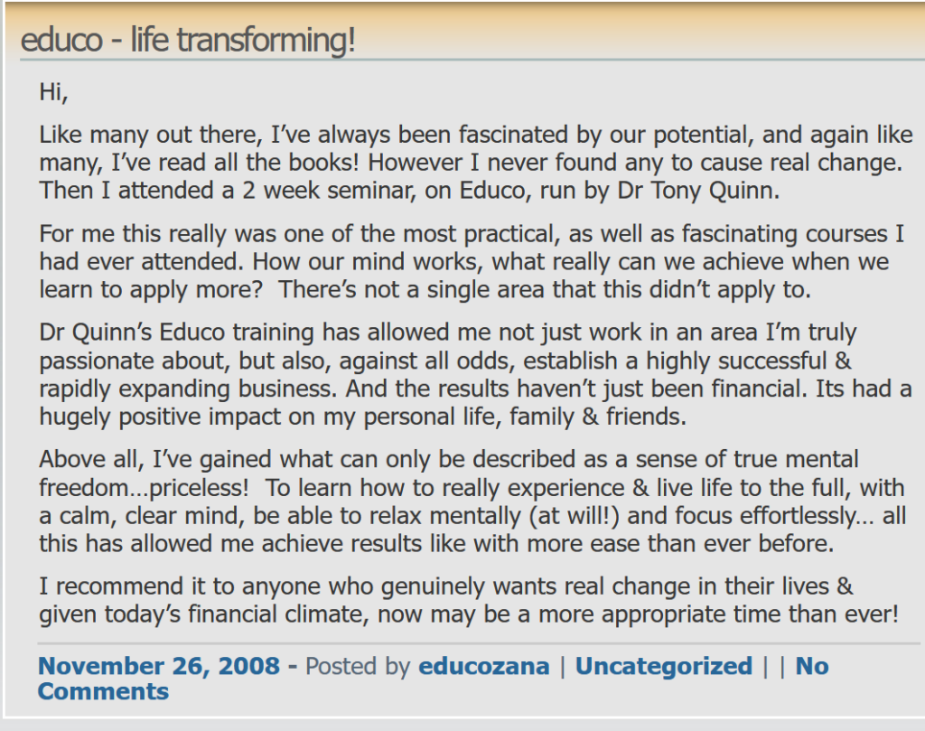 On the “EDUCO Success System” website Morris left another testimony using the name “EDUCO-Zana” in 2008: