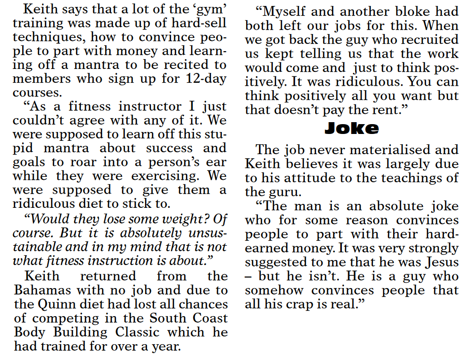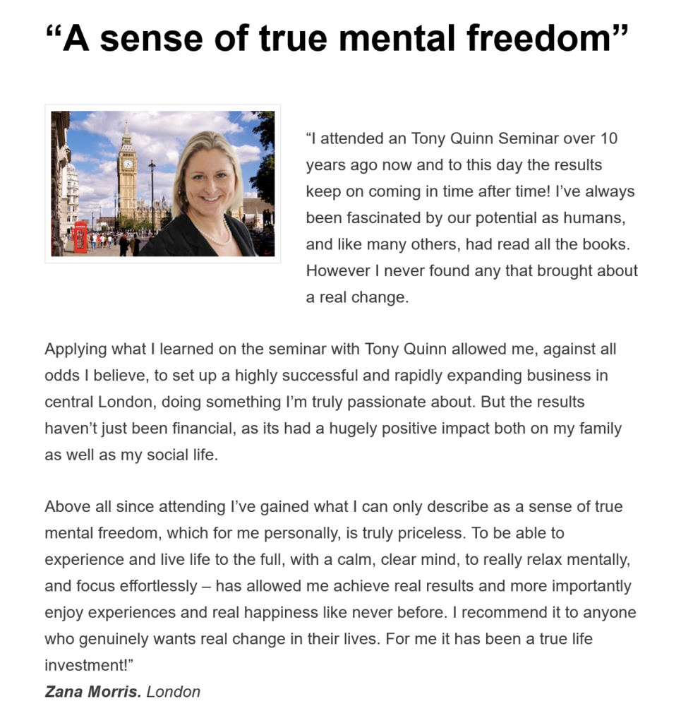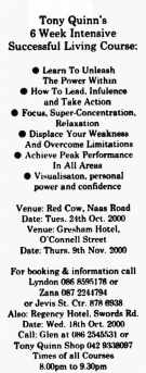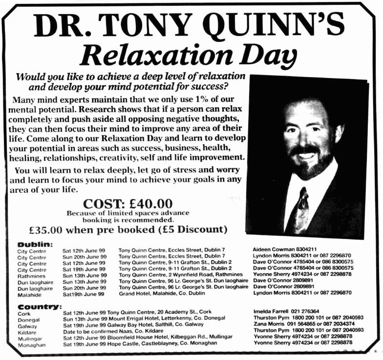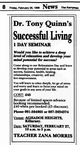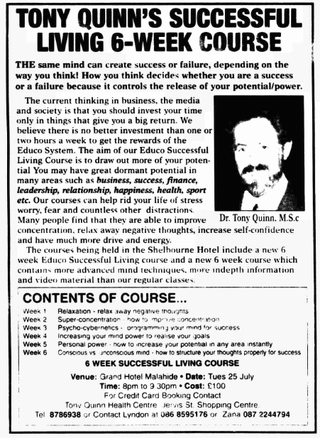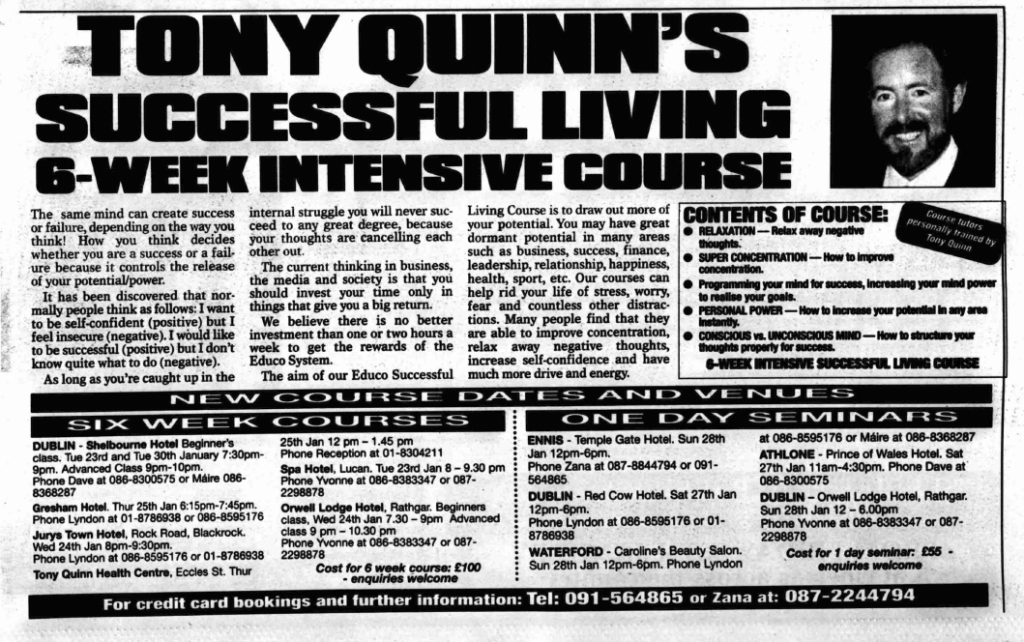 In October 2000 in the Irish Independent’s “Personal Notices” section, an advert was published naming Morris as a contact for “Tony Quinn’s 6 Week Intensive Successful Living Course”