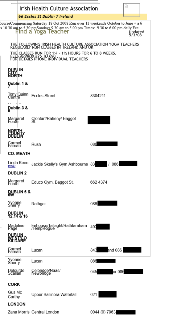 In 2005 Morris was listed as running “Dr” Tony Quinn Yoga classes in London, and listed on this EDUCO-connected website alongside EDUCO Cult stalwarts Margaret Forde (ex-wife of Martin Forde), Linda Keen, Carmel Farnan, Yvonne Sherry, Madeline Page, Dee Scallan and Gus McCarthy: