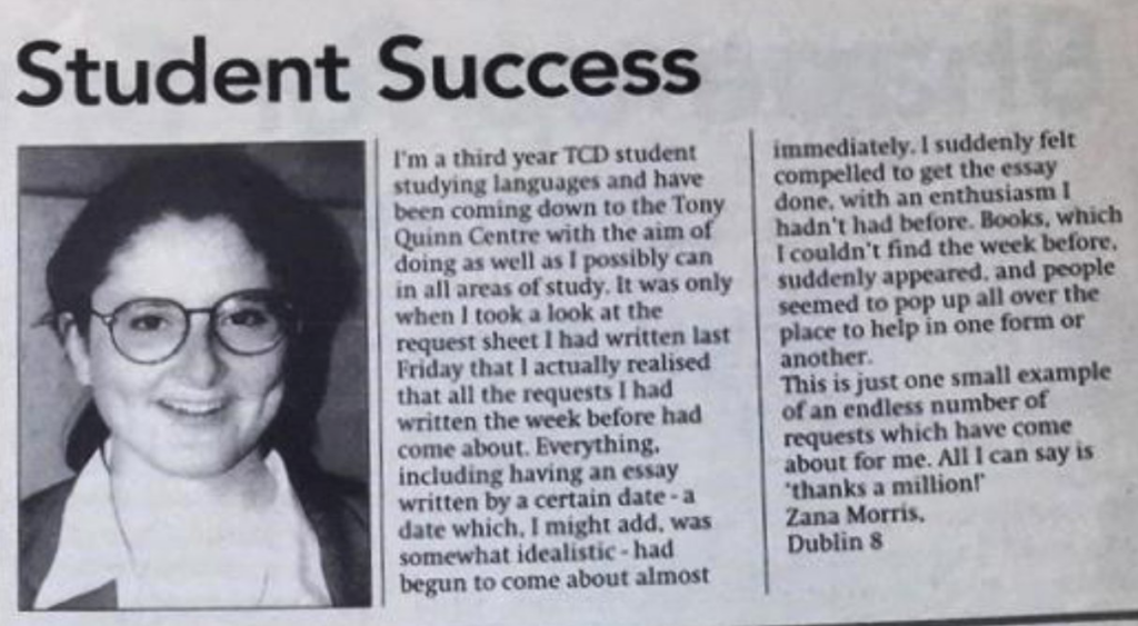 Zana Morris joined the EDUCO messianic Cult in the late 1990s, featuring in this 1995 Cult “newspaper” which was distributed in Ireland with the aim of recruiting people into Tony Quinn’s Cult.
