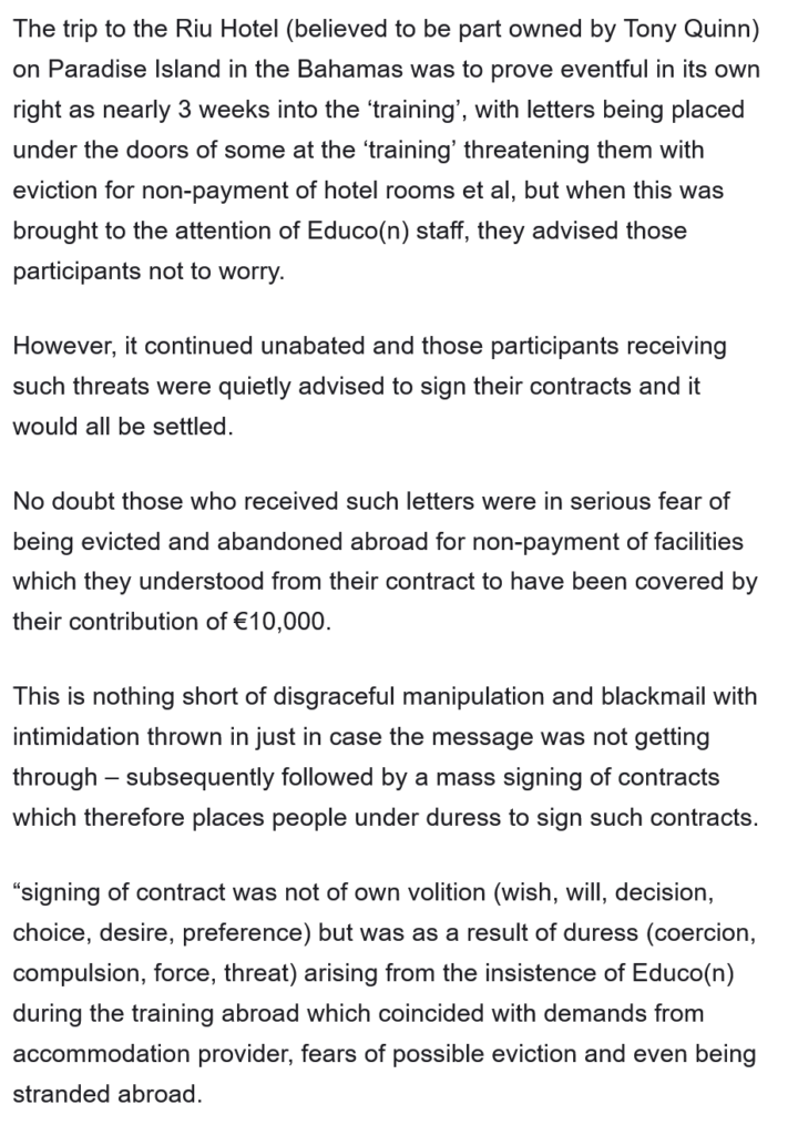 Also in 2009 the Clerical Whispers website, which usually reports on abuses within the Catholic Church, reported that attendees of the mandatory EducoGym training were coerced into signing employment agreements for fear of being evicted whilst in the Bahamas.