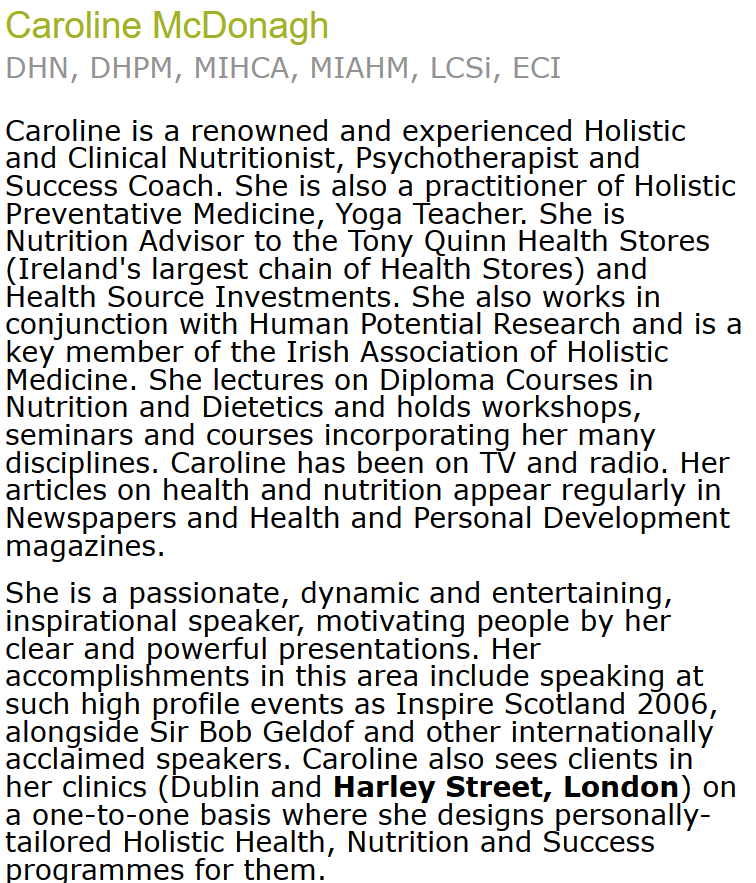 Caroline McDonagh, a close associate of EDUCO Cult leader “Dr” Tony Quinn, boasted in 2009 of meeting clients at the Harley Street base.