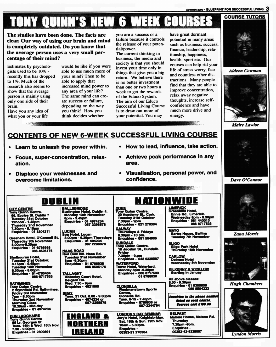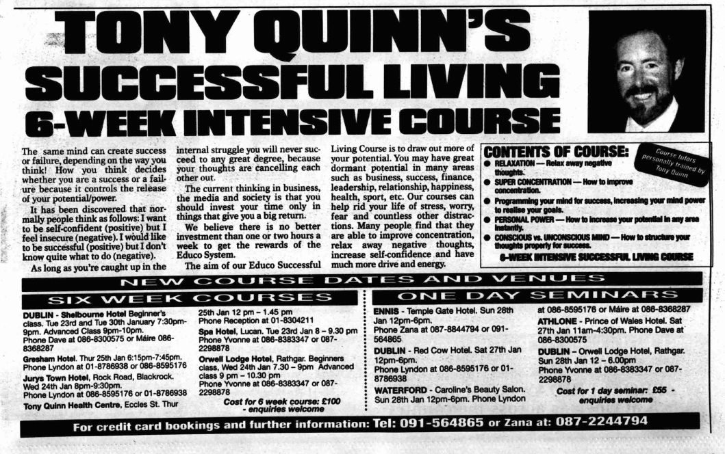 In October 2000 in the Irish Independent’s “Personal Notices” section, an advert was published naming Morris as a contact for “Tony Quinn’s 6 Week Intensive Successful Living Course”